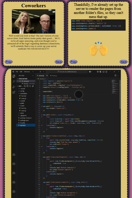 This interactive MVC tutorial application (somehow) makes learning fun! Walk through each step of taking single page server and converting it to work in an Models-Views-Controllers Architecture that fits industry best practices. Complete with both Touch and Arrow-Key Navigation!